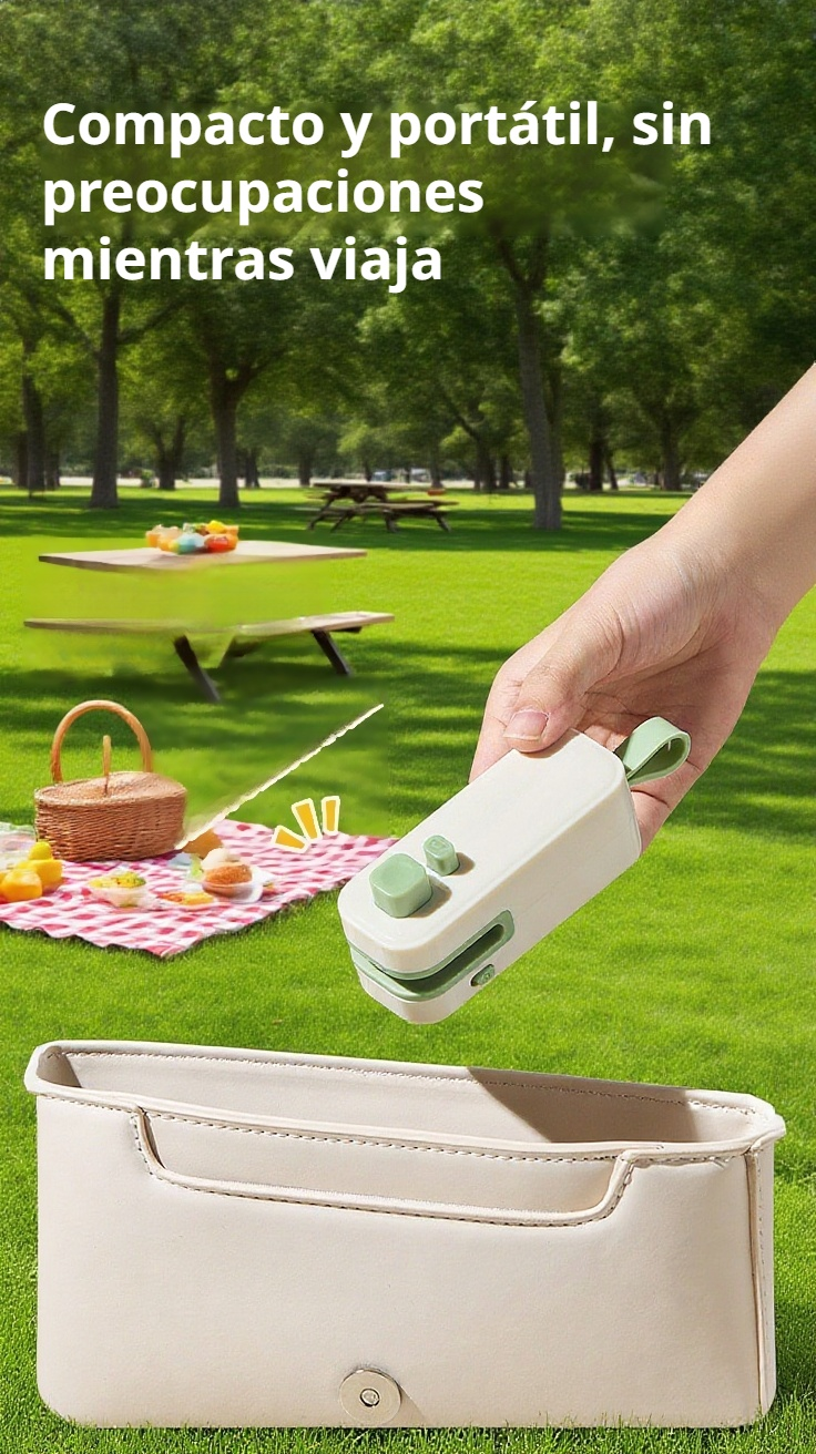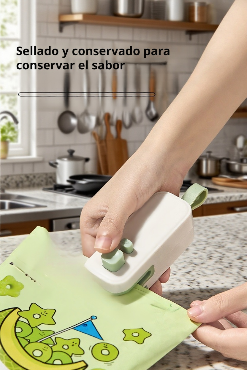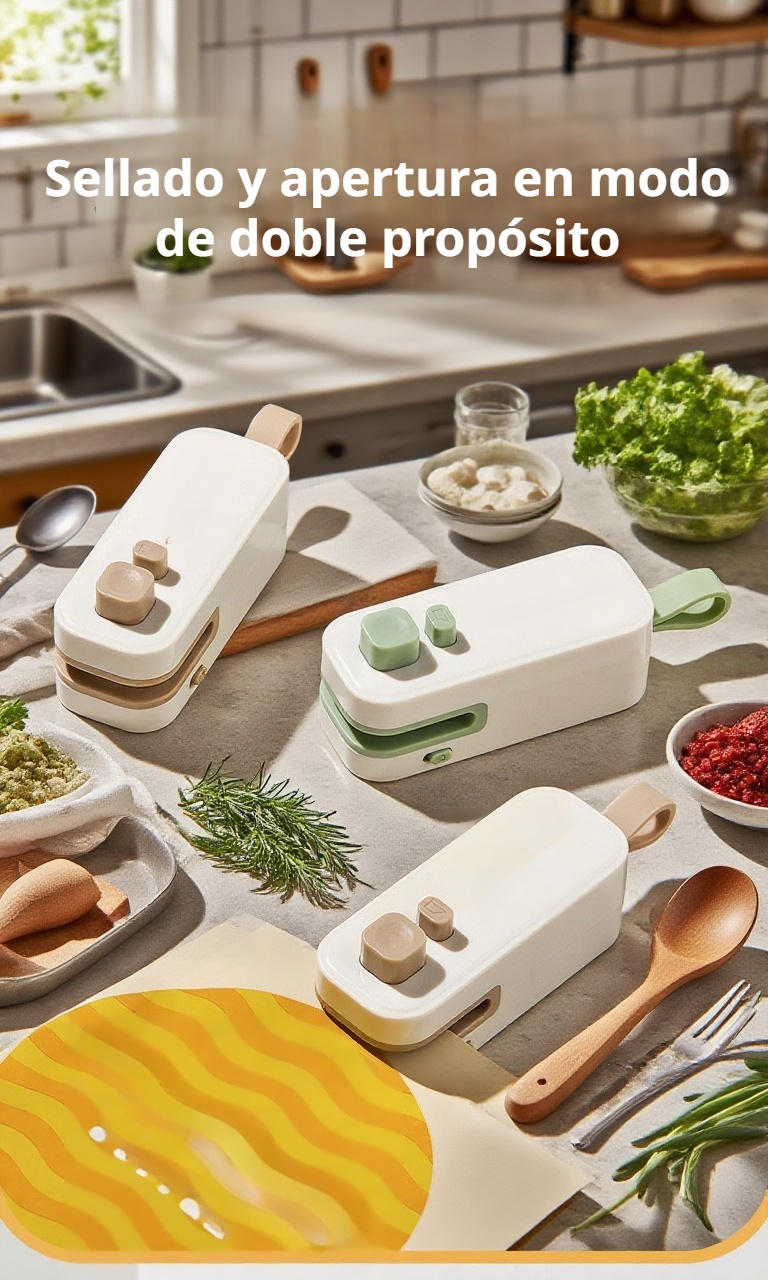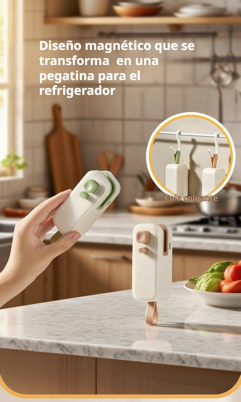 Selladora portátil con imán, doble función para bolsas. Sella y abre fácilmente, ideal para conservar alimentos y organizar espacios. Compacta y fácil de usar.